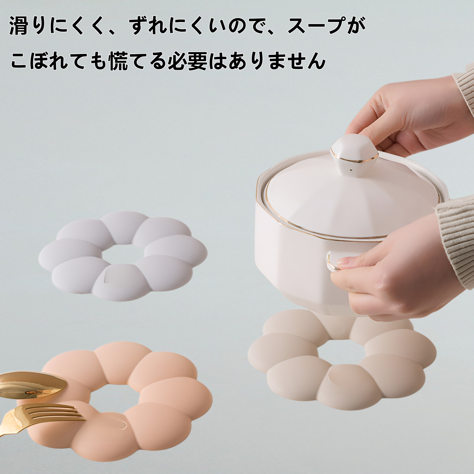 耐熱シリコン断熱パッド。鍋敷きやカップ、ボウルマットとして多用途。高温耐性・滑り止め・柔軟性・火傷防止設計。