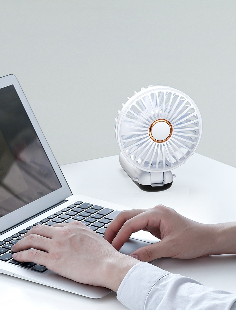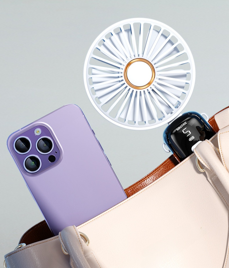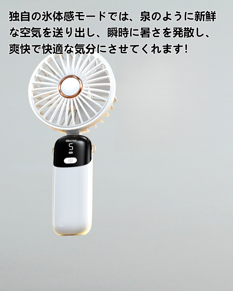 コンパクトな折りたたみ設計、強力な風量、氷感冷却、静音運転、デジタル表示、持ち運び便利なハンドヘルドファン。